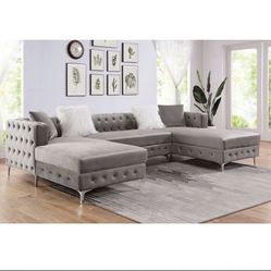 Beautiful Grey Velvet Sectional All Over Button Tuft Chaise On Left Side Firm Price $1,599 Financing Available Brand New In Box $1,599Moreno Valley, CA