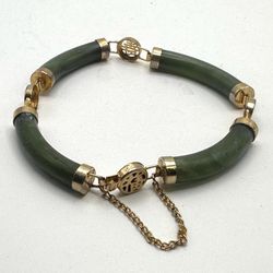 Vintage Green Jade Panel Bracelet with Gold Tone Plate Asian Character Links, Safety Chain intact, Gorgeous Vintage Green Jade$50Riverside County, CA