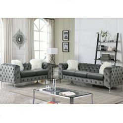 Stunning Grey Velvet All Around Tufting Sofa Loveseat Set With Chrome Legs White Fur Pillows Included Brand New In Box Firm Price $1,250 Financing Ava$1,250Moreno Valley, CA