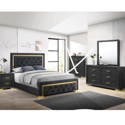 4 Piece Bed Set Black Velvet Gold Accent Set Includes Bed Frame 1 Nightstand 1 Dresser 1 Mirror Brand New In Box Firm Price Queen $680 EKing $740$680Moreno Valley, CA
