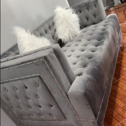 Grey Velvet Tufted Sofa Loveseat Set Nailhead Trim Accent Acrylic Legs Fur Pillows Included Brand New In Box Firm Price $1,140$1,140Moreno Valley, CA