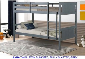 Twin over twin bunk bed. Available in espresso, white, & grey. Assembly required. Assembly not included. Tax included. Free local delivery.
