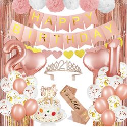 21st Birthday Decorations for Her, Happy Birthday Banner with Crown, Sash Candles, Heart Foil Confetti Balloons, Tissue Paper Pom, Rose Gold Fringe St$20Lodi, CA