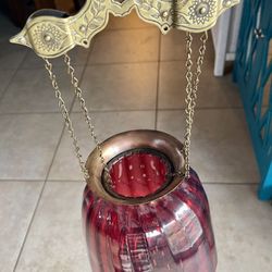 Antique Pull Down Victorian Hanging Hall Oil Lamp Red Cranberry Glass Globe Ornate Brass$150Stockton, CA