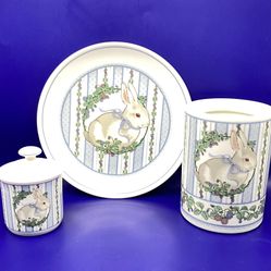 VTG 1986 George GOOD by Fabrizio Bunny Pattern w/Blue Floral Stripe SET Plate,Covered Sugar & Crock $50Visalia, CA