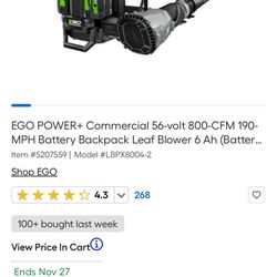 EGO POWER+ Commercial 56-volt 800-CFM 190-MPH Battery Backpack Leaf Blower $400Porterville, CA
