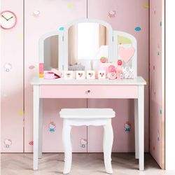 Kids Vanity, Girls Vanity Set with Tri-Folding Mirror, Stool, Storage Drawer, Princess Toddler Makeup Vanity Desk Dressing Table, Wooden Kids Vanity $40Hanford, CA