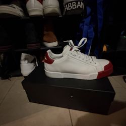 Dolce & Gabbana Portofino sneakers in white leather with a red rubber toe cap and heel accent. $200Merced, CA