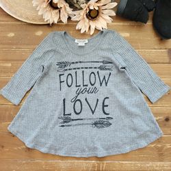 SIZE 10 GIRLS GRAY TEXTURED 'FOLLOW YOUR LOVE' THREE-QUARTER SLEEVES STRETCHY KNIT FLAIRED TUNIC$2Merced, CA