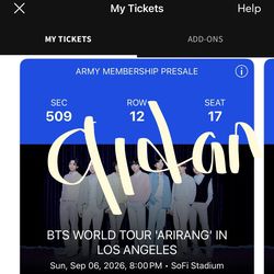 BTS Ticket SoFi Stadium$520Irvine, CA
