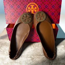 TB Tan / Gold 232 Flats Minnie Travel Ballet With Metal Logo Soft Napa Leather$120Irvine, CA