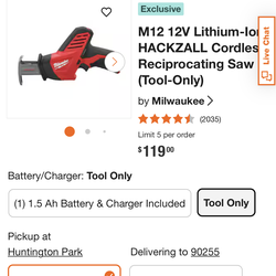 M12 12V Lithium-Ion HACKZALL Cordless Reciprocating Saw (Tool-Only)$100Cty Of Cmmrce, CA