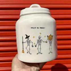 Rae Dunn “Trick Or Treat!” Dancing Skeleton Halloween White Cookie Canister Jar$10Brea, CA