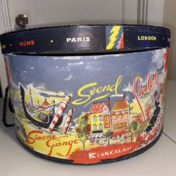 Vintage Multicolored Mid Century Modern French Round Hat Box Scenes of Paris damaged$60Corona, CA