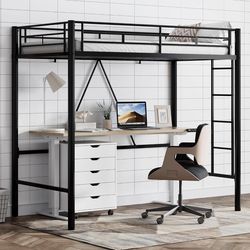 Full Size Loft Bed with L-shaped Desk and USB, Metal Loft Bed with Wardrobe and Adjustable Shelf, High Loft Bed with LED for Kids Teens Adults, Black$450Covina, CA