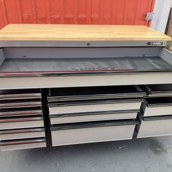 Husky Heavy Duty 61 in. W x 23 in. D 15-Drawer Matte Gray Mobile Workbench Cabinet with Solid Wood Top Has Small Dent On The Back $600Riverside, CA
