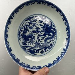 Antique Chinese Qing Style Blue And White Dragon Phoenix Dish 6 Character Mark$400Concord, CA