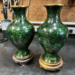 Pair of Chinese Emerald Green Floral Blush Pattern Cloisonne Vase On Wooden Base $150Concord, CA