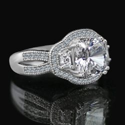 Intensely radiant 2 CT Diamond Veneer cubic zirconia Round Split Shank Square halo Sterling Silver Engagement/ Wedding Ring. 635R4009$69San Francisco, CA