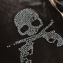 VTG retro black velvet mini dress S/M features long sleeves with white athletic-style stripes and a large rhinestone skull and crossbones with pocket$30Arrowhed Farm, CA
