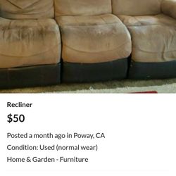 Leather Recliner Sofa - 3 Seat$299San Diego, CA