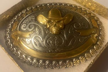 Vintage Metal Belt Buckle, Silver and Brass, Cowboy, Skull, Bones, Cowboy Till Death, Crumrine, Nice Western Design, 3 3/4" x 3", Heavy Duty, Quality,$40Lakeside, CA