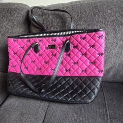 Stylish quilted tote bag has black and pink color block design with embroidered bow details. Materia$40Fontana, CA
