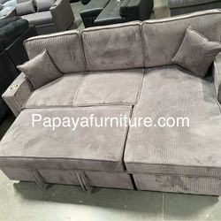 ✅️✅️4 pc Grey corduroy fabric sectional sofa with storage chaise and love seat and pop up sleep area in center USB charging✅️✅️$718Downey, CA