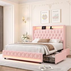 Full Size LED Bed Frame with 4 Storage Drawers & Charge Station, Modern Wingback Upholstered Platform Bed Frame, Pink Velvet$200Rancho Cucamonga, CA