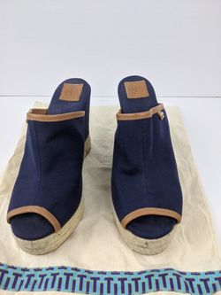 Tory Burch open toe canvas wedge sandal leather trim size 7$145Corona, CA