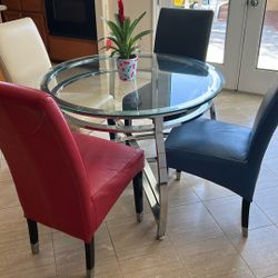 Round Clear glass Dining table Silver Legs And 4 Leather Chairs$200Fontana, CA