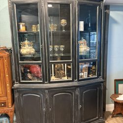 Vintage China Cabinet, Farmhouse Black China Cabinet Glass Display Shelves With Light, Bottom Door And Drawer Storage$100Riverside, CA
