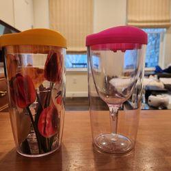 Tervis 16oz Tumbler with a yellow lid, featuring a floral design insert & Vino2Go double-wall insulated acrylic wine tumbler with a pink lid, good con$5Parker, CO