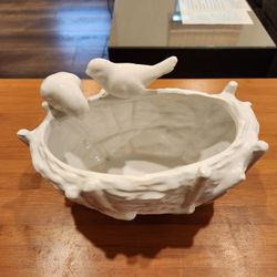 Birds Nest Bowl planter candy Dish catch-all White Bird Bath Perched on Rim 6", rare find , great condition , 5.5 " tall $10Parker, CO