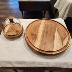 acacia wood cake stand 6.25" diameter with a glass dome lid and 12" serving tray $6Parker, CO