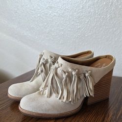 Kork Ease High Heels Womens 8M Charley Mules Fringe Slip On Beige Leather Boho$40Aurora, CO
