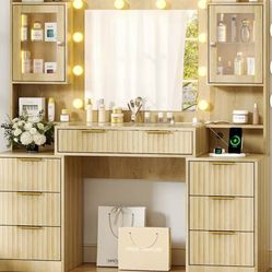 ✌️ Large Makeup Vanity with 7 Drawers, Flutted Vanity Table Set with Lighted Mirror, Wood Color, 56”Wx55.5”Hx16”D$288Denver, CO