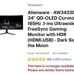 Alienware - AW3423DWF 34" QD-OLED Curved 165Hz .1-ms Ultrawide FreeSync Gaming Monitor with HDR (HDMI,USB) - Dark Side of the Moon$350Castle Rock, CO