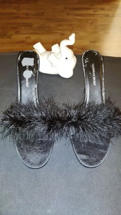 NEW women 10 black slide mule sandal heel satin faux fur feather$10Denver, CO