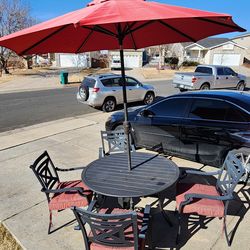 metal table with 4 chairs, cushions and umbrella$148Aurora, CO