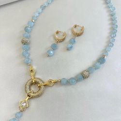Natural Aquamarine AAA High Quality necklace set with CZ micro pave pendant and Real 18K gold plated earrings - light blue & gold - Handmade Necklace$110Aurora, CO