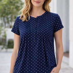 Lands’ End Women’s Small Navy Blue Polka Dot Pintuck Short Sleeve Blouse Top New$45Westminster, CO