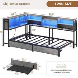 ๐ Twin size Hasuit Corner Bed Frame with 2 Drawers and Storage Bookcase, Daybed with Charging Station and LED Lights, Metal Platform Bed with Bookshl$121Denver, CO