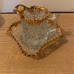 Creamer and saucer vintage clear glass with gold trim somewhere on trim consistent with age saucer 5” x 5” jug 4 1/2” x 4”$19Goshen, CT