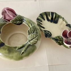 1940s Art Nouveau Style Porcelain Dish / Ashtray + Bowl Applied Magnolia Hand-Painted Flowers $55Garden City P, NY