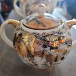 3 Piece Vintage Porcelain Leaf Pattern Creamer, Sugar Bowl & Teapot Set Gold USSR$150Stamford, CT