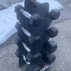 Complete set of 2.5 lbs to 15 lbs rubber hex dumbbells with storage rack$100Saint James, NY