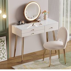 KDCAS Vanity Desk with Mirror and Lights| 39" Beige Modern Makeup Vanity Set with Drawers & Adjustable Chair| White and Gold Dressing Table for Small $100Springfield, PA