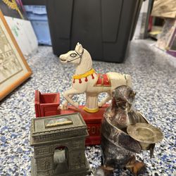 Vintage Collectible Set – Trick Pony Cast Iron Bank, Arc de Triomphe Mini Bank, and Silver Penguin Candle Holder$140North Miami Beach, FL