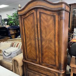 Tommy Bahama style armoire featuring a dark wood finish and rattan-style accents - 40” x 21” x 79”$89Fort Lauderdale, FL